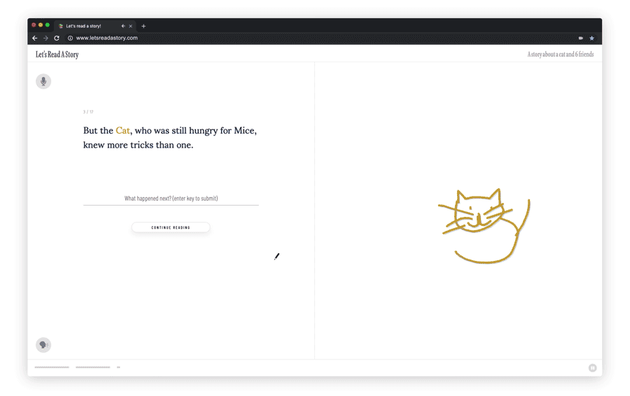 To enrich the stories, I chose to use a recurrent neural network trained on the quick, draw! dataset. The story algorithm knows how to identify different elements in the text and using the ml5 library and p5.js, draws them to the page as the sentence is being added.